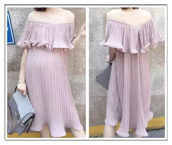 韩版一字肩雪纺孕妇连衣裙,宽松的板型,显瘦遮肉,性感的露肩的设计,百褶元素极具时尚感,粉嫩的浅紫色,将肤色衬托得更加白皙透亮,雪纺的面料,凉爽亲肤。