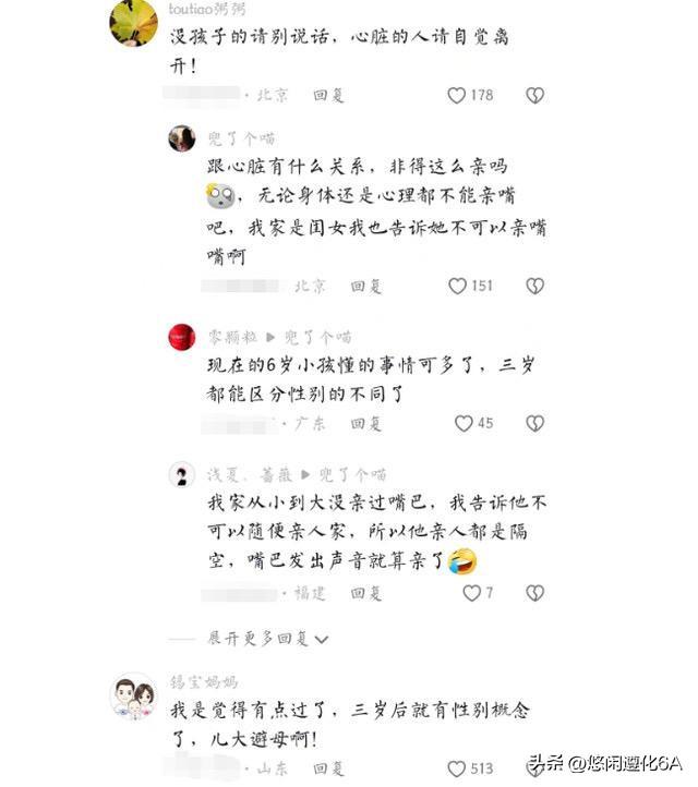 网友们看到这纷纷发表了自己的看法,有说“太诡异了,亲锁骨,手往胸上放。”“不太能接受。”“再过几年不会就变成‘岁月致柔’了吧。”“六七岁就该避开这样的亲密接触了!个人感觉。